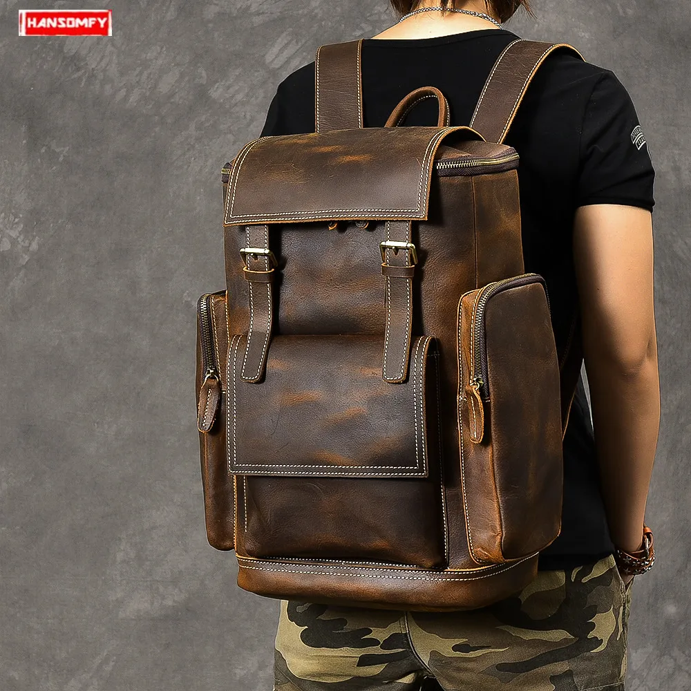 Promo Crazy Horse Leather Men's Backpack Large Capacity first Layer Leather male shoulder bags Vintage 17