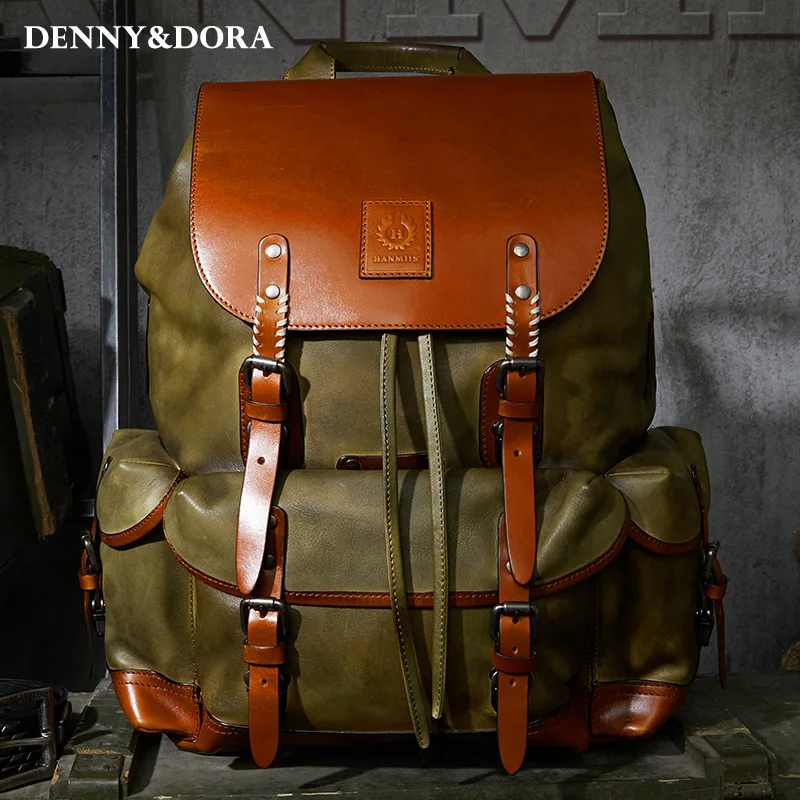 Discount Leather Bag Simple Military Style Luxury Mens Cow Leather Backpack Travel Bag Large Capacity Retro